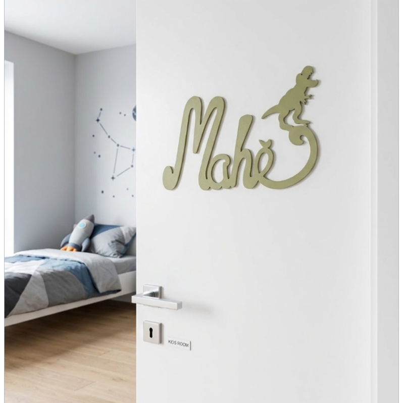 Découvrez cette jolie plaque de porte personnalisée en bois, avec motif Dino en bout de prénom, de couleur tendance Feuille de Palmier.