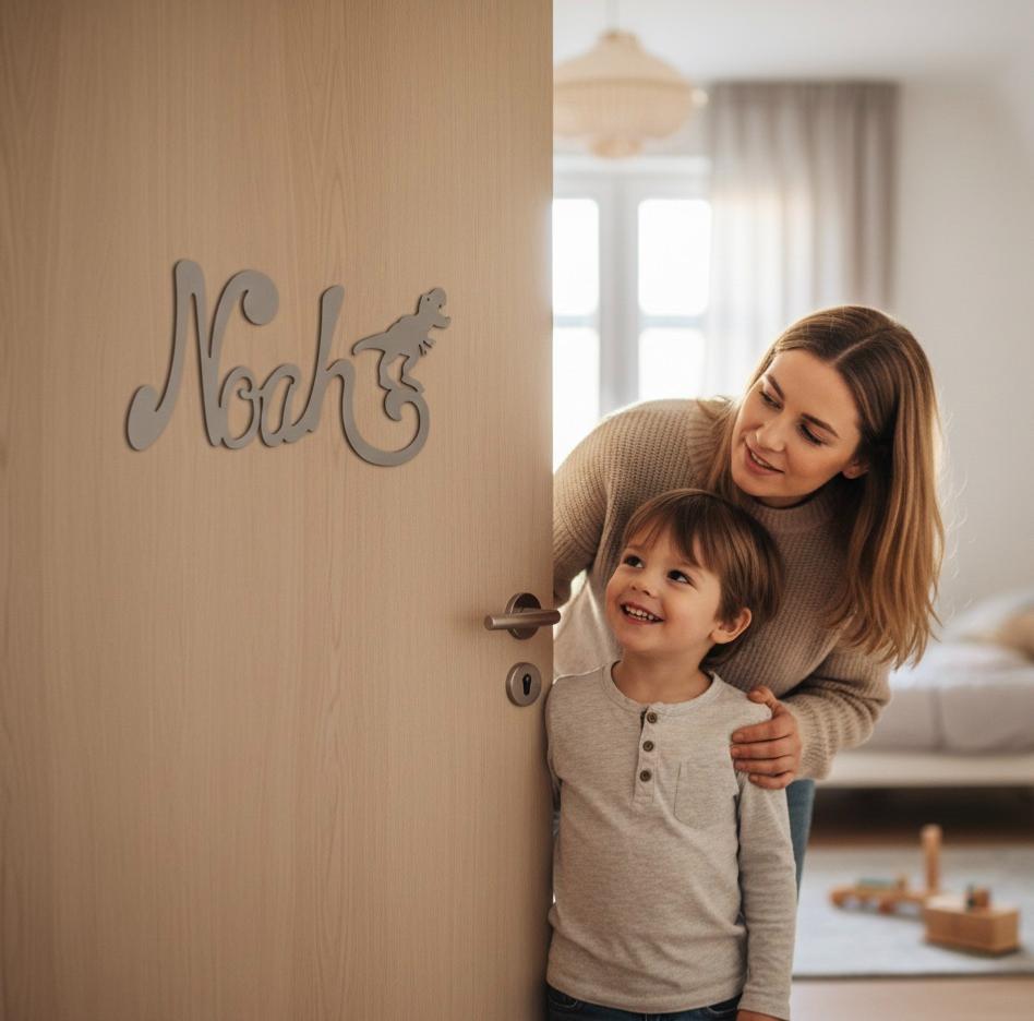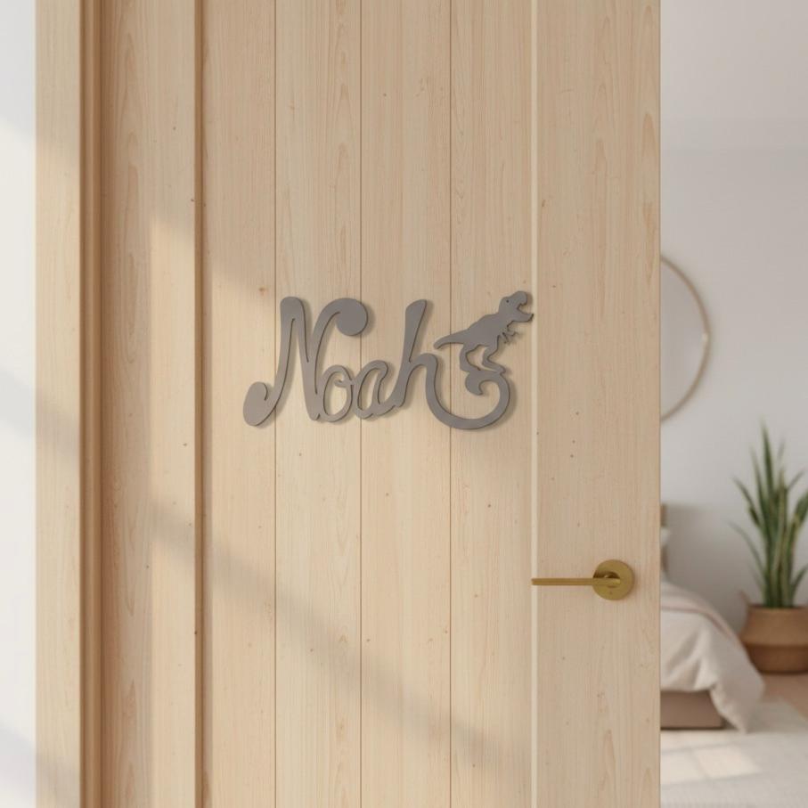 Découvrez cette jolie plaque de porte personnalisée en bois, avec motif Dinosaure en bout de prénom de couleur mastic.