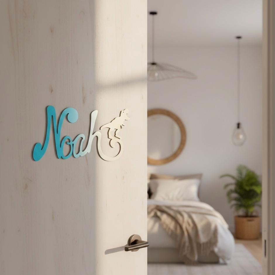Découvrez cette jolie plaque de porte personnalisée en bois, avec motif Dinosaure en bout de prénom de couleur dégradé Turquoise/Ecru.