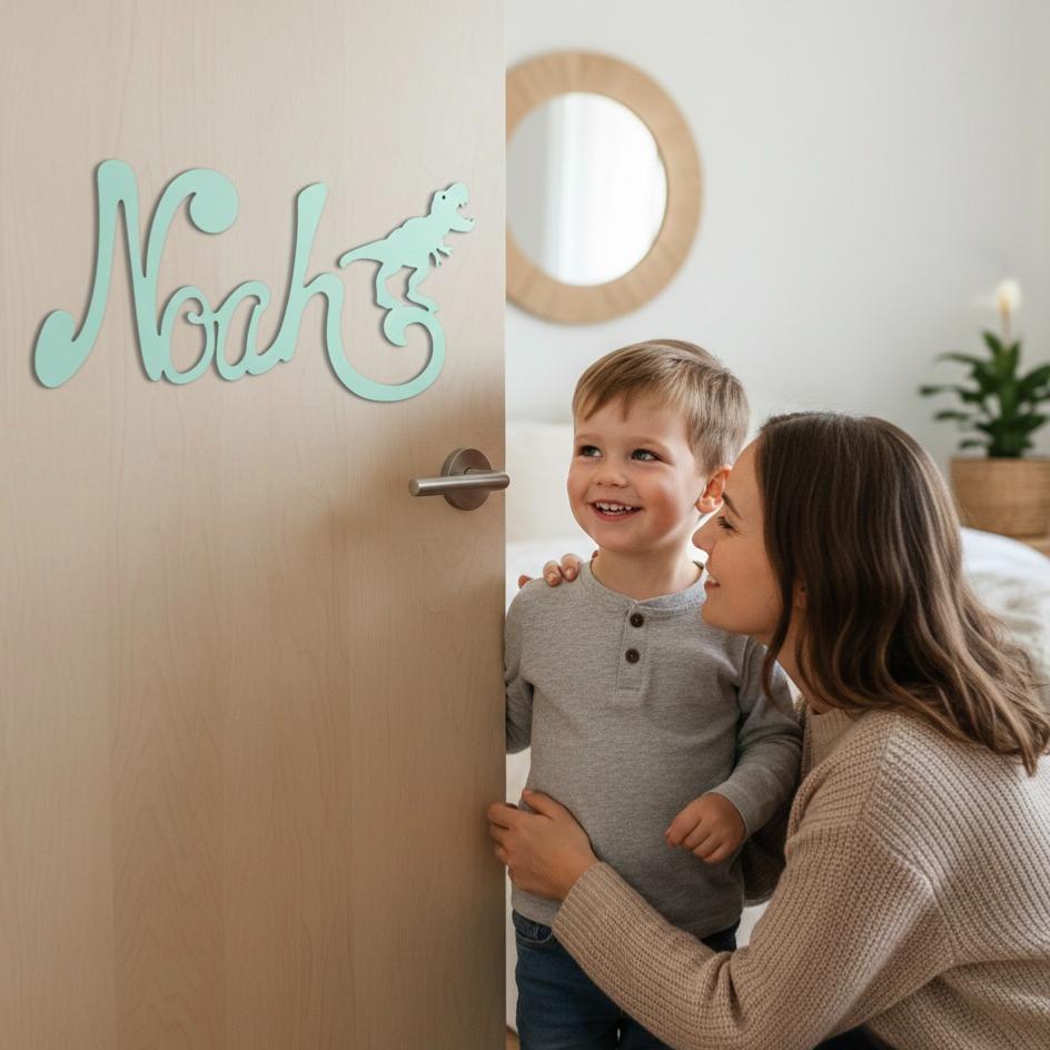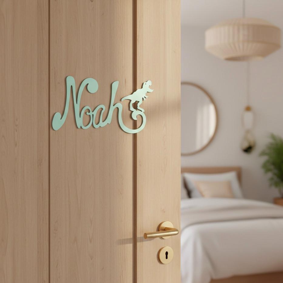 Découvrez cette jolie plaque de porte personnalisée en bois, avec motif Dinosaure en bout de prénom de couleur vert.