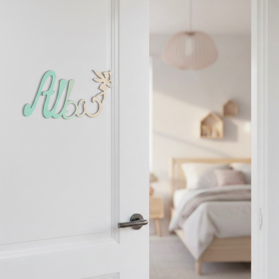 Découvrez cette jolie plaque de porte personnalisée en bois, avec motif Fée en bout de prénom, de couleur dégradé Vert/Ecru.