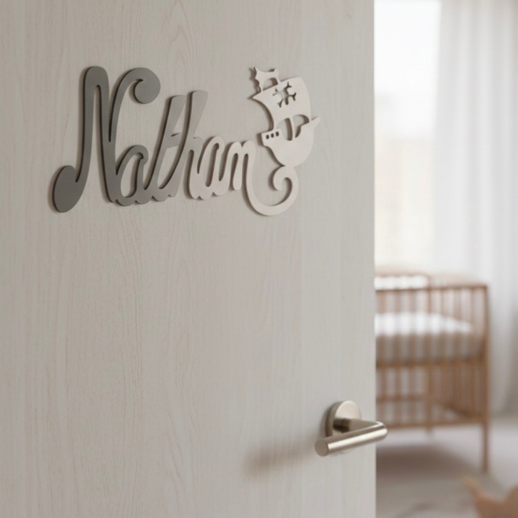 Découvrez cette jolie plaque de porte personnalisée en bois, avec motif Pirate en bout de prénom de couleur Mastic.