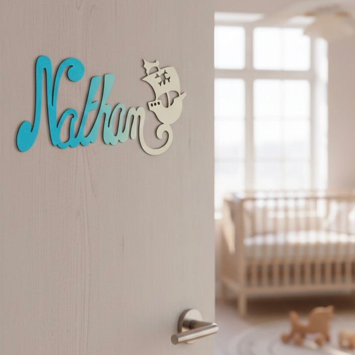 Découvrez cette jolie plaque de porte personnalisée en bois, avec motif Pirate en bout de prénom de couleur dégradé Turquoise/Ecru.