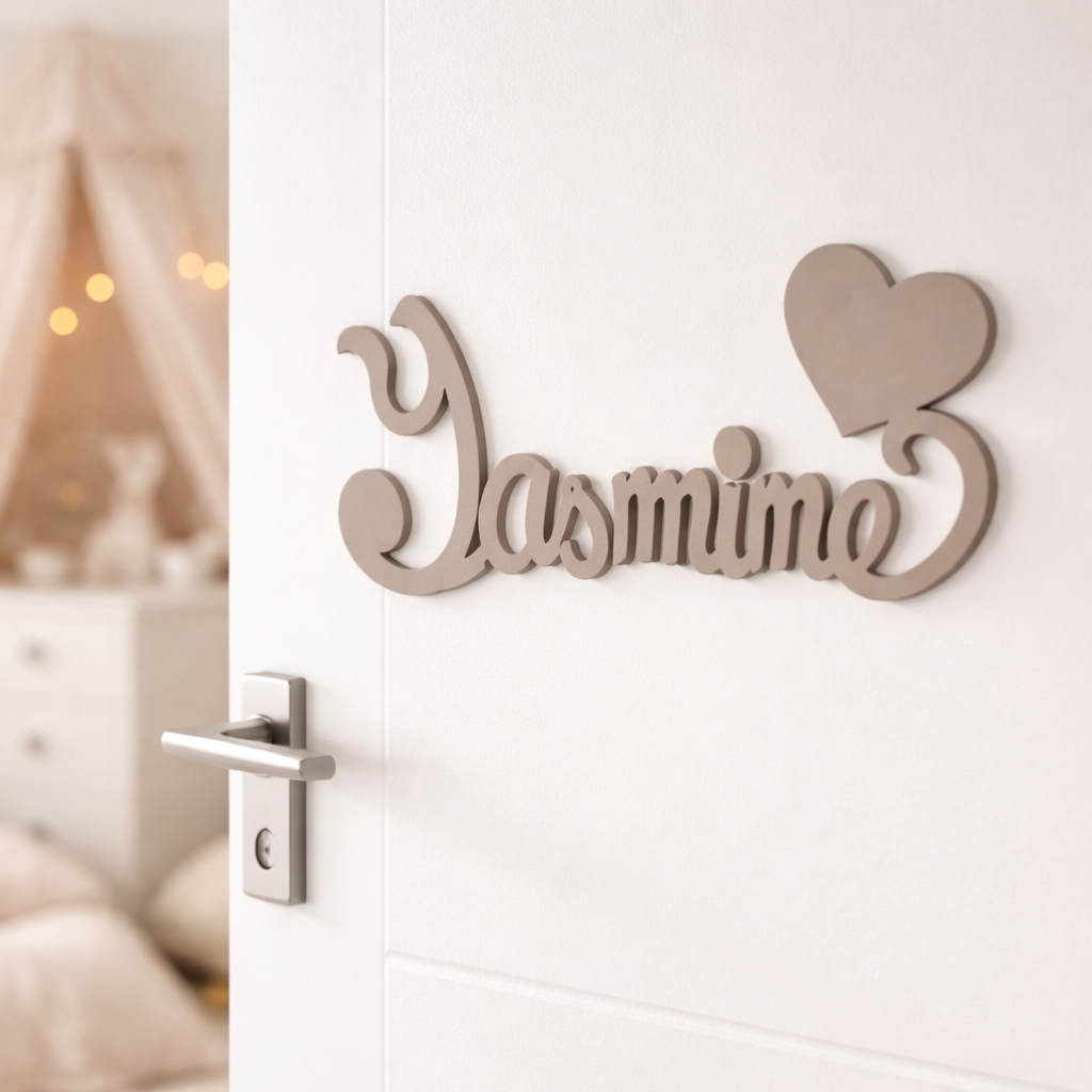 Découvrez cette jolie plaque de porte personnalisée en bois, avec motif Cœur en bout de prénom, de couleur Mastic.