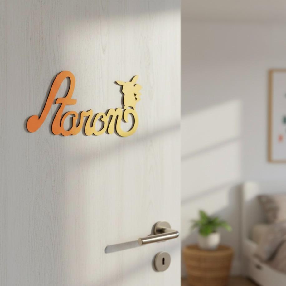 Découvrez cette jolie plaque de porte personnalisée en bois, avec motif Pikachu en bout de prénom, de couleur dégradé Orange/Jaune.