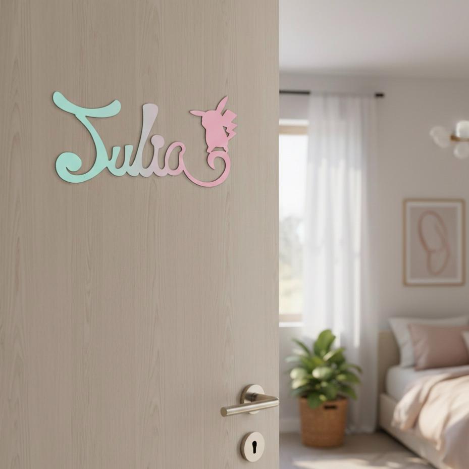 Découvrez cette jolie plaque de porte personnalisée en bois, avec motif Pikachu en bout de prénom, de couleur dégradé Vert/Lilas.