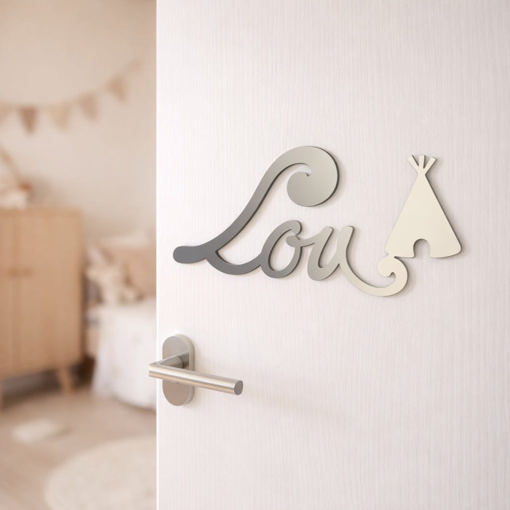Découvrez cette jolie plaque de porte personnalisée en bois, avec motif Tipi en bout de prénom, de couleur dégradé Anthracite/Ecru.