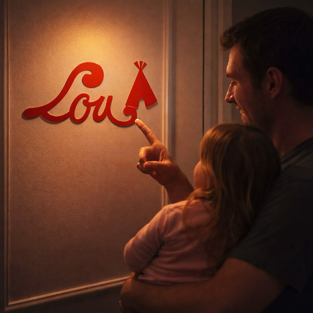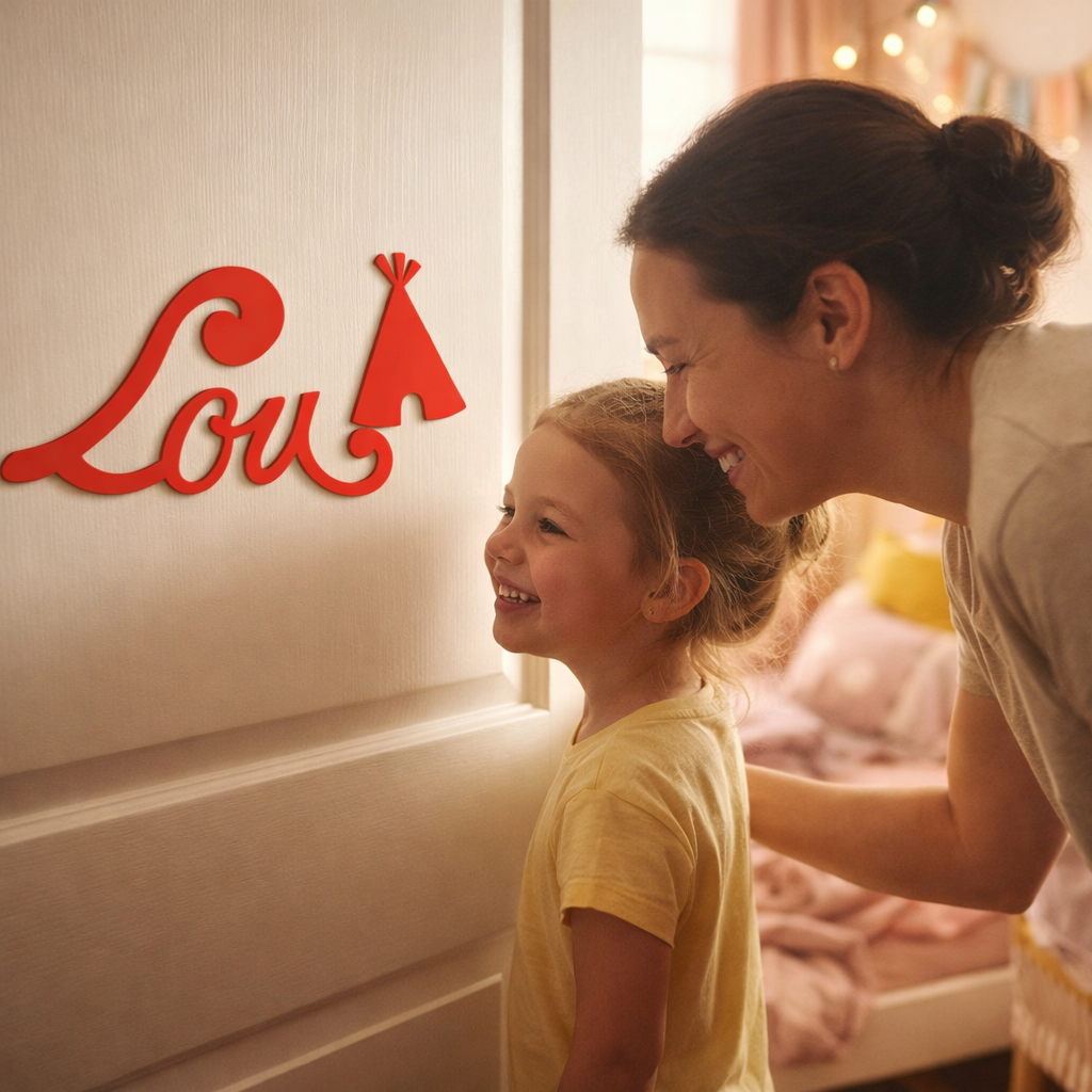 Découvrez cette jolie plaque de porte personnalisée en bois, avec motif Tipi en bout de prénom, de couleur Rouge.
