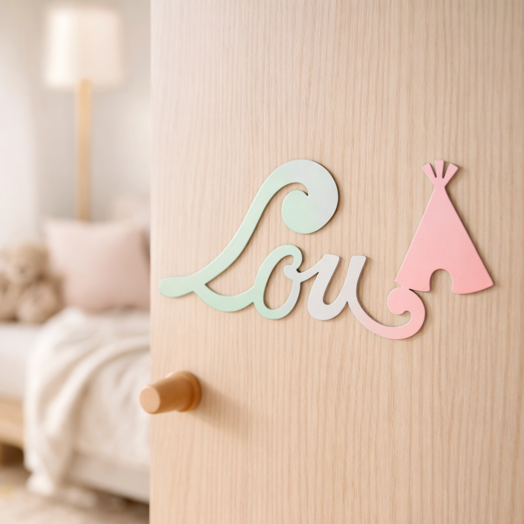 Découvrez cette jolie plaque de porte personnalisée en bois, avec motif Tipi en bout de prénom, de couleur dégradé Vert/Lilas.